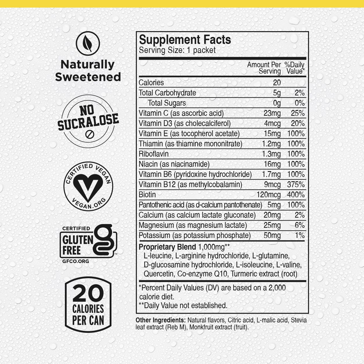 A zero-sugar, caffeine-free, naturally sweetened recovery powder that delivers BCAAs, electrolytes, and essential vitamins in one convenient stick. Just add water to recover, replenish, and get back in action without the crash or the junk. (Same clean formula you love in a can, just in a convenient powder packet).
