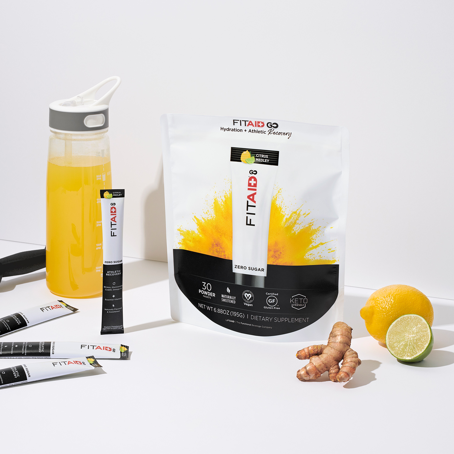 FITAID GO is a clean, on-the-go powder mix inspired by the classic FITAID Recovery Blend. It’s a convenient way to enjoy a crisp, refreshing blend of essential vitamins and electrolytes, anytime, anywhere.