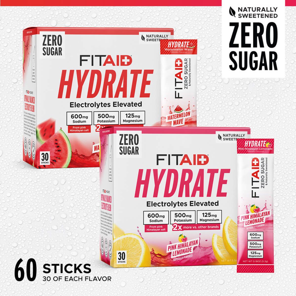 FITAID Hydrate is also a zero-sugar product, naturally sweetened with monk fruit and stevia to provide refreshment without a sugar spike or an aftertaste. In addition to Watermelon Wave, it's also available in Pink Himalayan Lemonade.