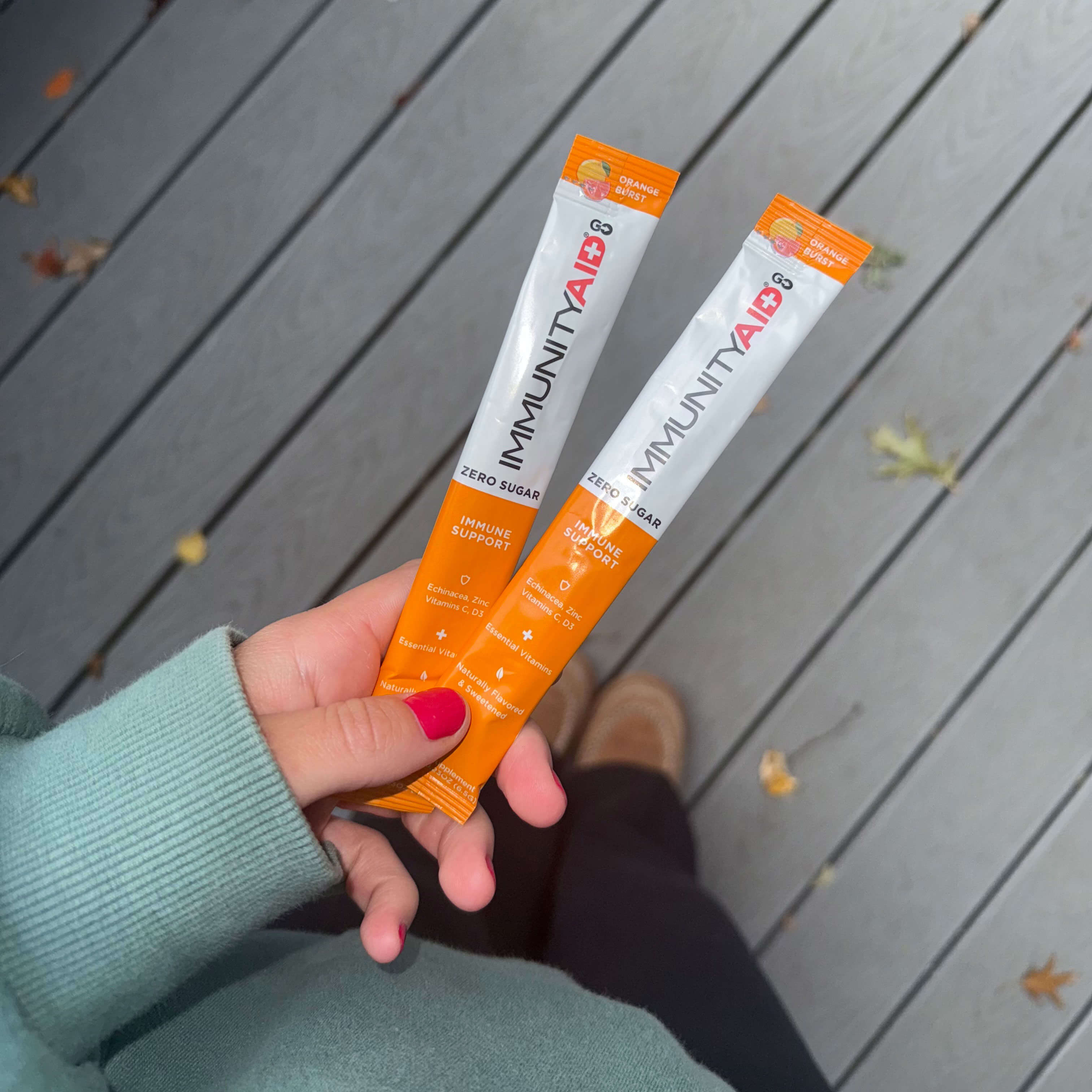 IMMUNITYAID GO is a naturally flavored powder mix made with vitamins C, D3, zinc, and botanicals like echinacea and astragalus. It’s an easy way to keep your wellness routine consistent wherever you go, all year round.