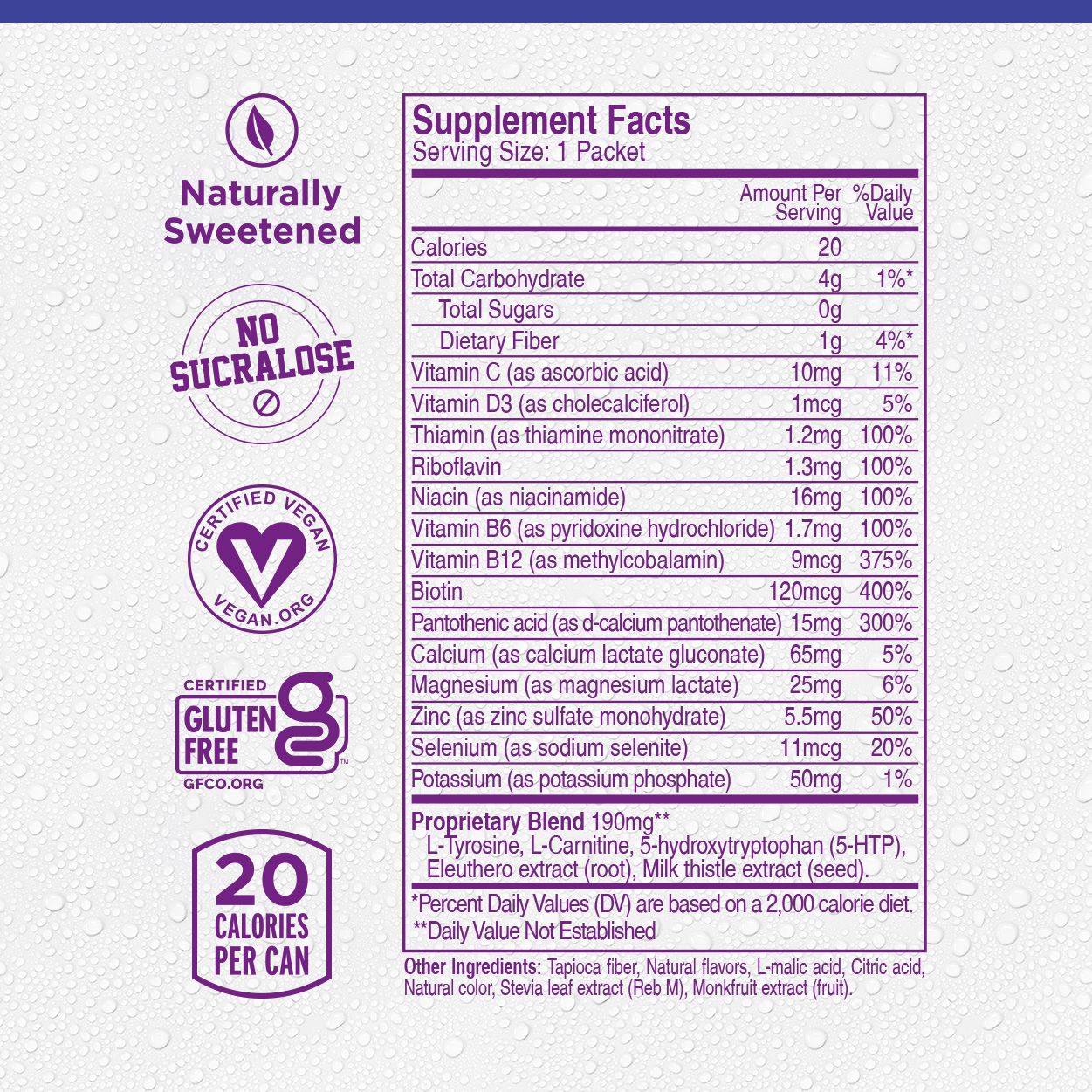 This light, replenishing blend with vitamins such as milk thistle and 5-HTP is designed to help you feel refreshed after the fun. Naturally sweetened and zero sugar, it’s your easy, mix-anywhere companion for the next day.
